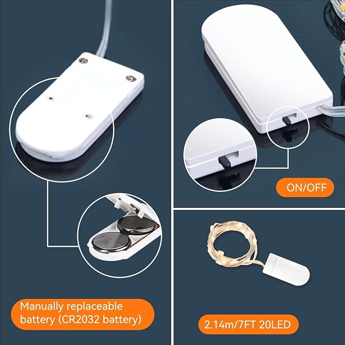• 【 Newly Upgraded Battery Powered Fairy Lights 】Powered by 2 CR2032 batteries (included), the 7-foot long miniature fairy light is equipped with 20 upgraded energy-saving LEDs, making it perfect for daily and holiday decorations. Thin copper wire and small-sized LED bulbs will add a delicate and comfortable touch to your personal space.