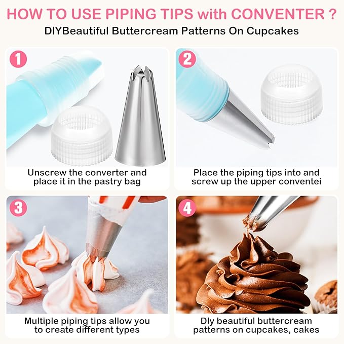 - Large Piping Tips Set: Piping tips large comes with an adapter that fits most piping bag interfaces on the market. No additional tools are needed to quickly change the nozzles, making cake piping tips easy to use for both novice and professional bakers
