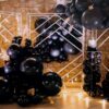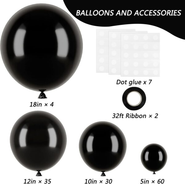 - BLACK PARTY BALLOONS KIT: Includes 129 Black Balloons – 18inch 4pcs, 12inch 35pcs, 10inch 30pcs, 5inch 60pcs and 7 pieces of glue, 2 rolls of ribbon of the same color. Balloon strip is not included. Multi sizes of matte black balloons help shape a unique Halloween balloon arch and graduation balloons garland.