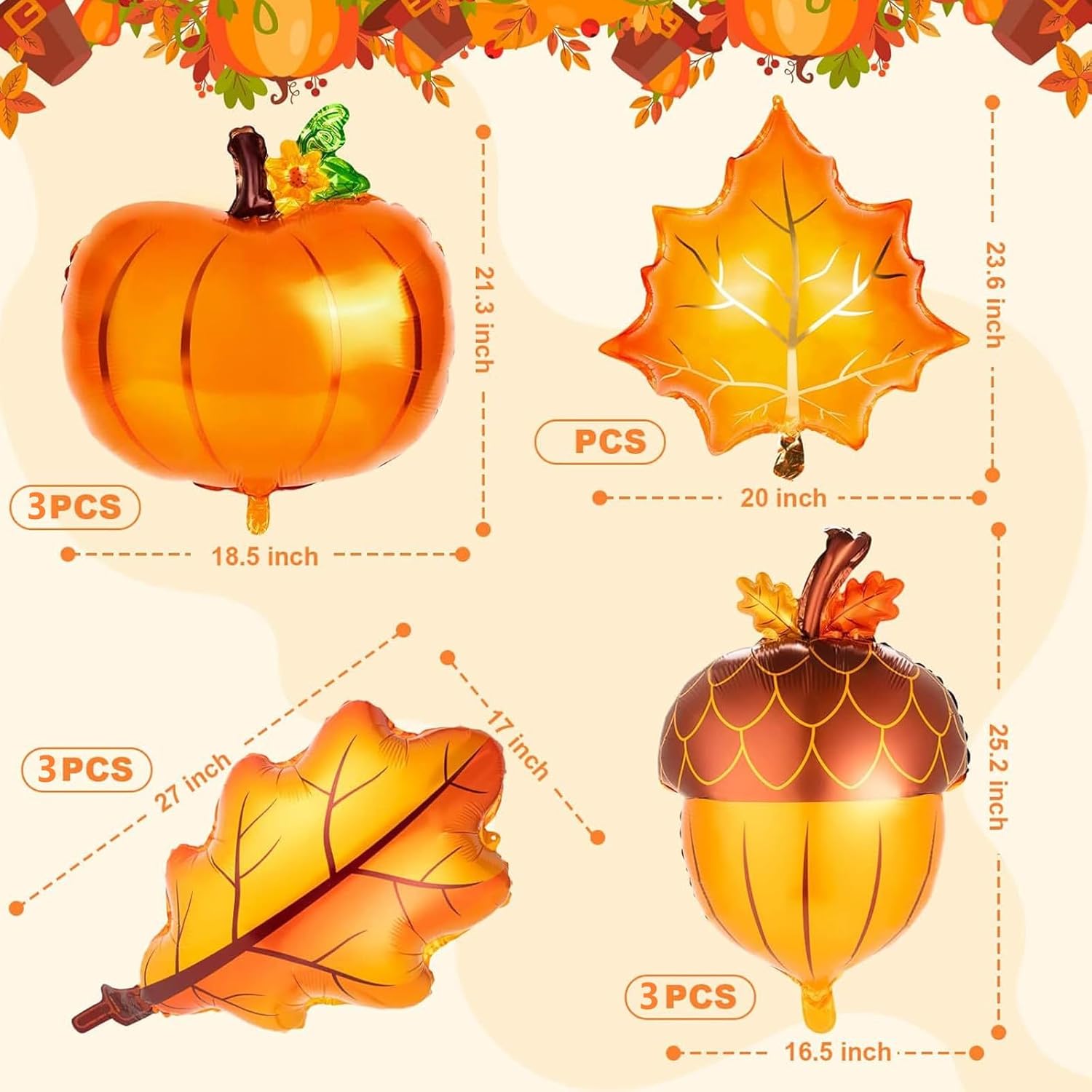 - 【You Will Get】You will get 12 pieces of fall balloons, Including maple leaves, pumpkins, and acorns in large sizes in 4 different shapes and styles, they were the ideal choice for a Thanksgiving party, and sufficient quantities, and diverse styles can meet your decoration needs at Fall