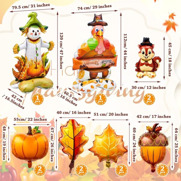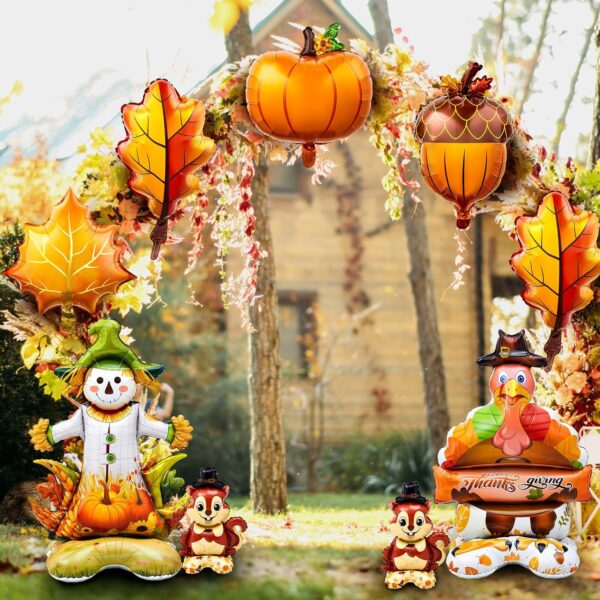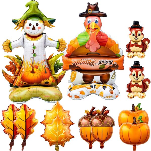 - Comprehensive Package: this harvest party decorations pack offers a total of 12 dimensionally diverse balloons, including 1 jumbo scarecrow balloon, 1 large turkey balloons, 2 orange leaves, pumpkin, pine cone, maple, and squirrel balloons respectively; The assortment of designs and quantities allows you to be versatile with your decorating plans