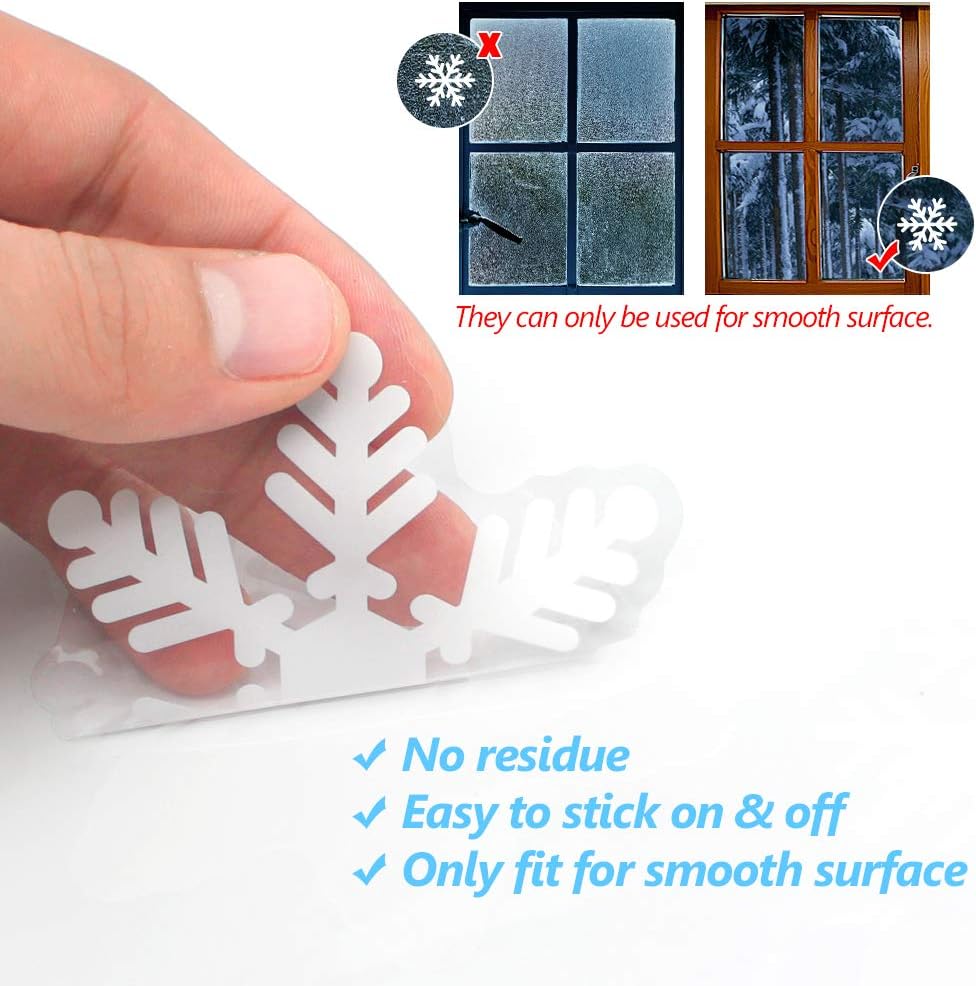 • MERRY CHRISTMAS SPIRIT: Xmas window clings, perfect as snowflakes window decorations, will beautify your holiday home décor, create a happy Xmas atmosphere for you all, make the perfect finishing touch to your Christmas window décor. With snowflakes window clings, enjoy your walking into a white wonderland!