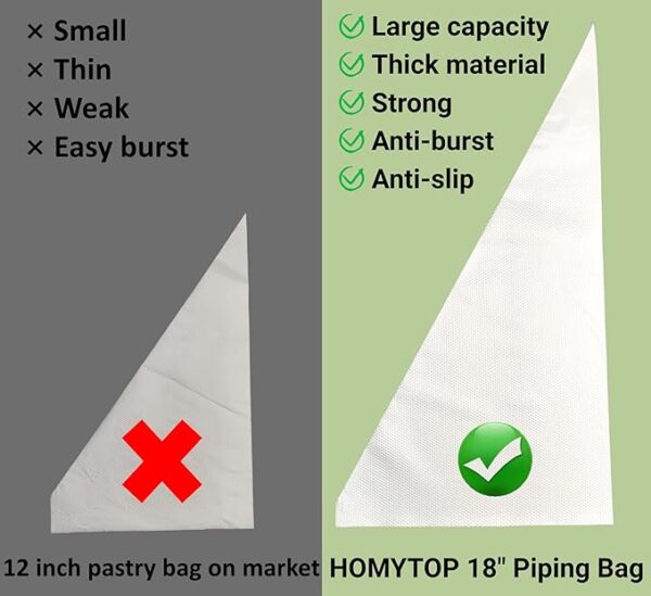 • Unparalleled Capacity: Our 18 inch piping bags boast a remarkable 1-liter volume, larger than most 12 and 16 inch piping bags in the market. Bid farewell to frequent bag changes and embrace uninterrupted creativity.