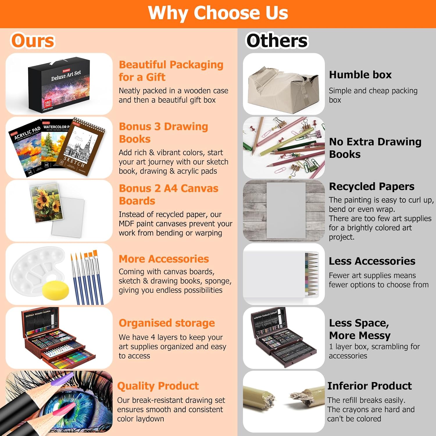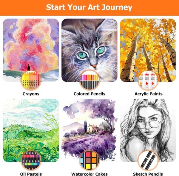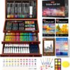 - 【Complete ALL-IN-ONE Deluxe Wooden Art Box】192-pack Deluxe Art Set includes a wide range of art supplies: 60 crayons, 24 colored pencils, 24 oil pastels, 24 watercolors, 24 acrylic paints, 11 sandpapers, 8 brushes, 8-well palettes, 3 A4 canvases, 1 color wheel, 1 sponge, 1 color palette, 1 HB pencil, 1 2B pencil, 1 eraser, 30 sheets sketchbook, 20 sheets acrylic pad, 20 sheets drawing pad, 1 sharpener, 1 wooden case, 1 Gift box, perfect art kit for beginners and artists of all levels.
