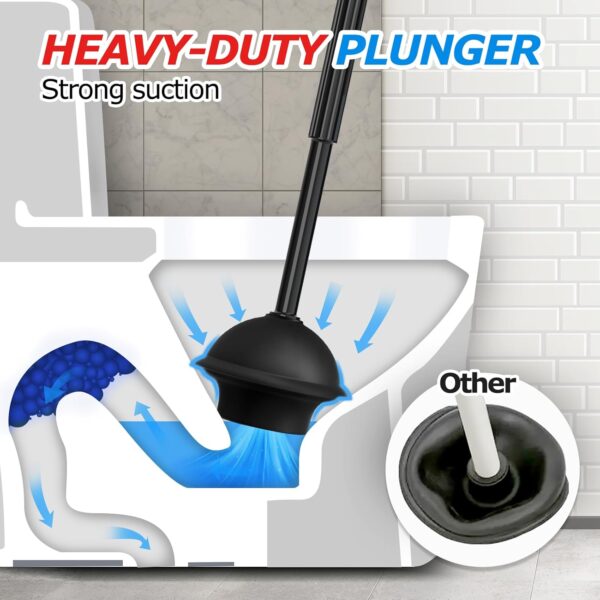 - Extended handle -Heavy Duty Toilet Plunger: Compared to ordinary handles, our upgraded extended handle provides a better user experience and prevents stains from splashing onto the hands.A professional powerful suction cup that can solve various blockage problems. Comfortable handles provide greater support during use.