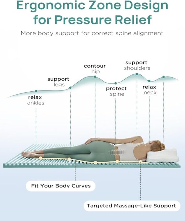 • 【Elevated Pressure Relief 5-Zone Design】- Releep unique WAVE and CUBE Dynamic design divides the full size mattress topper into 5 zones, delivering targeted support for your head, shoulders, back, hips, knees, and feet. This innovative design helps easing body pressure and promotes proper spinal alignment, making it perfect for relieving back pain. No more pain sleep with Releep cooling bed topper