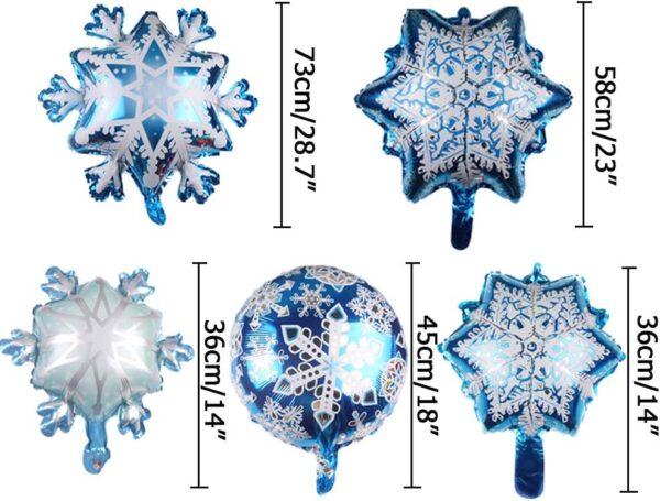 • Size detail – the small snowflake balloon’s diameter is approx. 45 cm/ 18 inches, the large snowflake balloon’s diameter is approx. 73 cm/ 28.7 inches and that of the hexagonal snowflake balloon is about 58cm/22.83 inches.