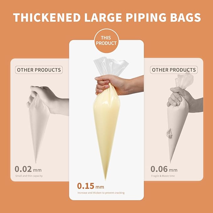 • Premium Quality Thickened Material:These Thick Sturdy Pastry Piping Bags are Made of Food Grade Hdpe and Specially Thickened with Anti-Burst Strength and Flexibility,Thick Enough To Bear Pressure of Squeezing and Frosting Without any Burst Or Leakage.Don’T be Afraid of Squeezing the Bag Anymore.