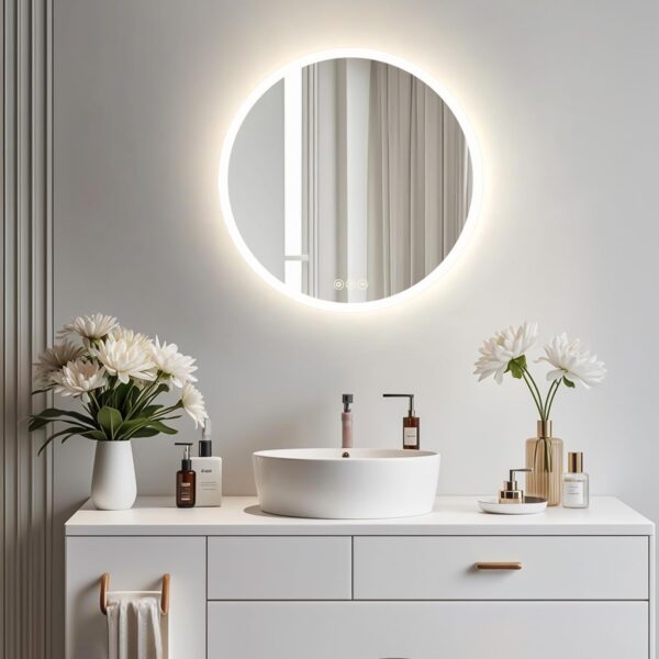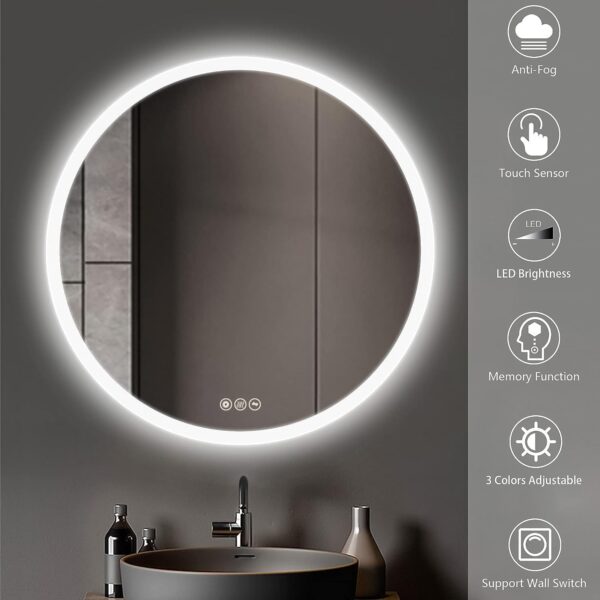 24″ Round LED Bathroom Mirror, 3-Color, Dimmable, Memory, Backlit