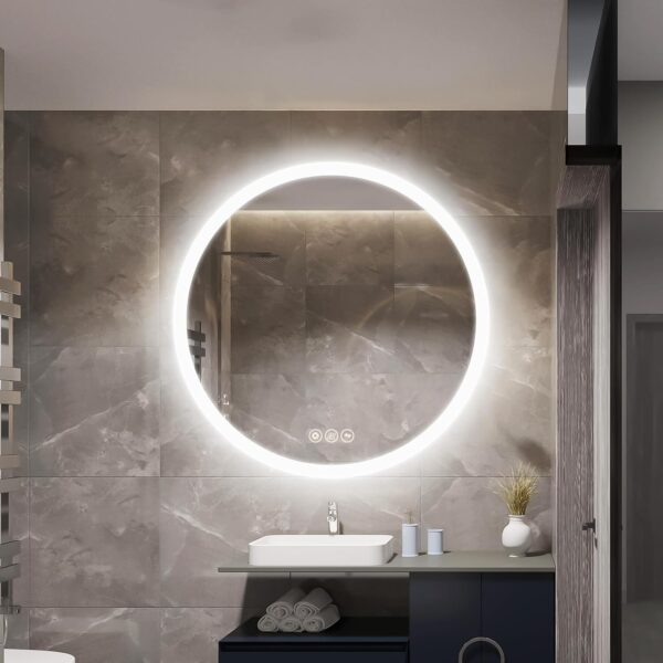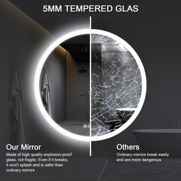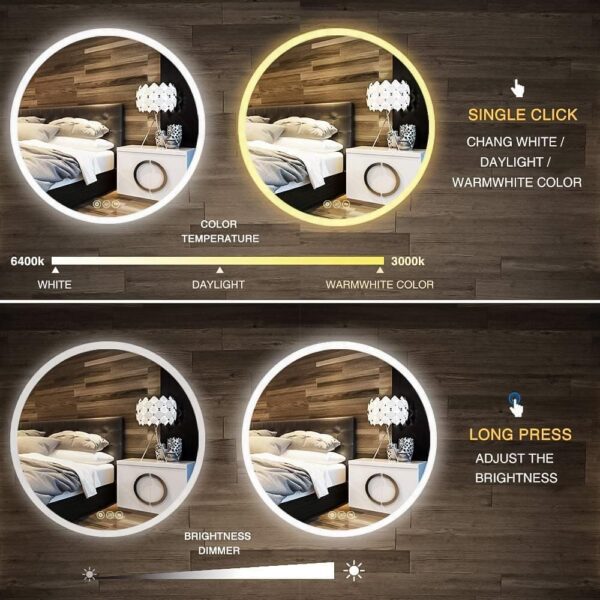 • Smart Memory】: Round bathroom mirror with Lights will remember your light settings when you turn off the mirror, and when you turn it on again, the light will return to the setting before it was turned off, which is more convenient