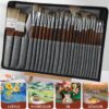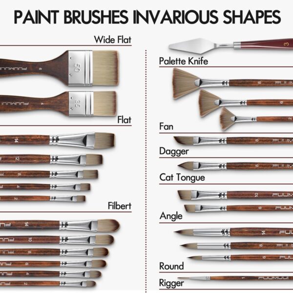 • Variety of Shapes & Sizes: Paint brushes for acrylic painting set includes 24 brushes in 9 series (Large Wide Flat, Flat, Filbert, Fan, Dagger, Cat Tongue, Round, Angle, Rigger), 1pc palette knife, 1pc portable canvas roll. A selection of sizes allows you to bring your vision to life on a large scale, in tiny detail, or anything in between!