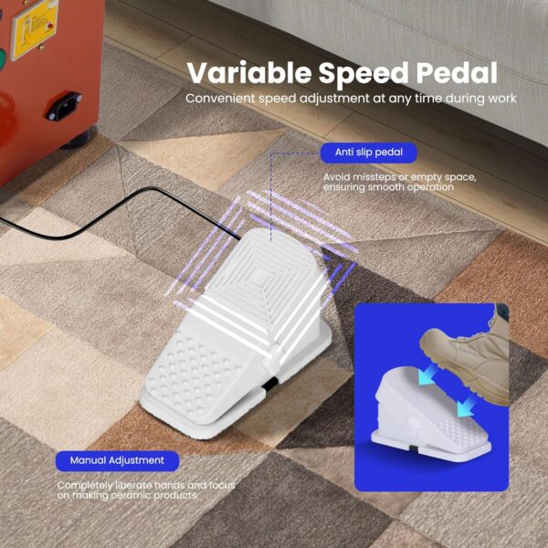 - SIMPLE OPERATION – Comes with a foot pedal for adjusting the rotary speed (0-300 RPM) of the pottery wheel, providing you with a hand-free experience; The convenient knob enables easy switching between forward and reverse directions, ensuring stable wheel operation with low noise (under 60 dB); A non-slip texture enhances durability and provides better control