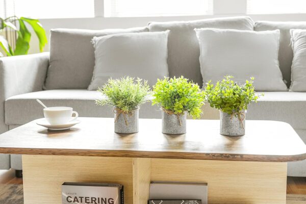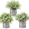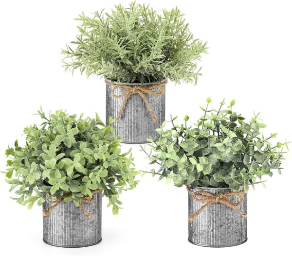 - Mini pots with 3 different fake plants in eucalyptus, boxwood, and rosemary, come already set in its own galvanized metal pot for easy displaying. A great way to add modern decorative touch and some natural greenery to your living space.