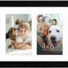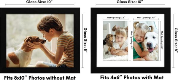 - Our 8×10 frame with classic molding is crafted from engineered wood and displays one 8×10 photo or two 4×6 photos with mat (actual mat size: 3.5×5.5″). The shatter-resistant glass adds a refined finish, making this sleek frame truly stand out.