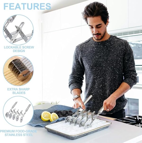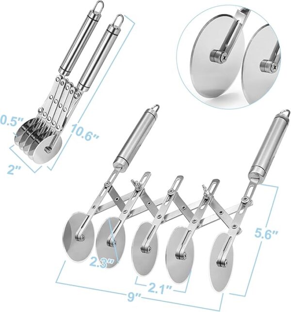 • 1:Versatile 5-Wheel Pastry Cutter Tool Effortlessly cut cookie dough, pasta, brownies, or pie crusts with this 5-wheel pastry cutter. Designed with adjustable and sharp stainless steel blades, it doubles as a pasta cutter wheel, pizza cutter wheel, and lattice cutter pastry tool for precision slicing.