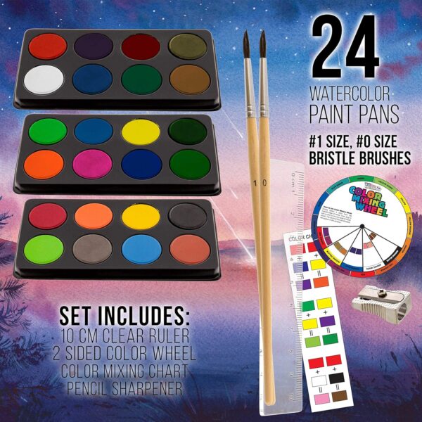 - This unique creativity set also comes with 20 additional pieces; a 24 sheet 9″ x 12″ watercolor painting paper pad, a 30 sheet 9″x 12″ premium sketch paper pad, an 80 sheet 5.5″ x 8.5″ premium hardbound field sketchbook, 15 premium paintbrushes, a plastic painting palette, and a double-sided color mixing wheel.