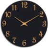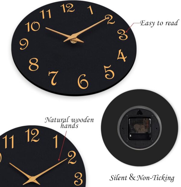 - Simple Design–> Made of white MDF clock face and black Arabic numbers, brown wooden hour and minute hands, [no second hand] & [no frames] & [no glass]. This is a completely simple wall clock and it does not float if left in the bathroom for a long time.