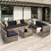 • 【8 PIECE SET WITH HIDDEN STORAGE】 Our outdoor patio furniture set includes seven (7) sectional sofas with plush cushions and a tempered glass top table with a hidden storage compartment.