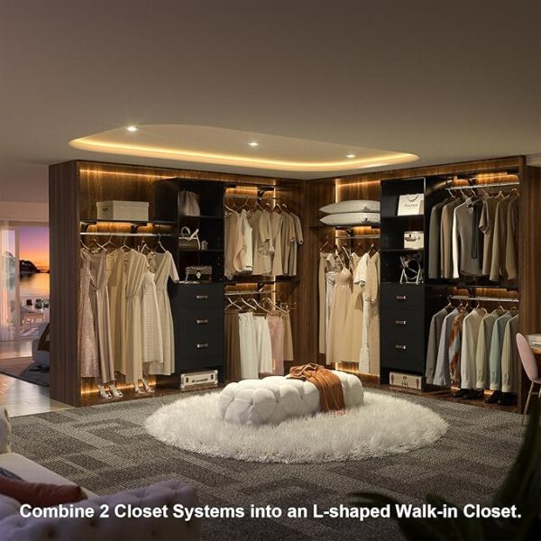 • 【8FT Closet System with 3 Drawers】This closet system has a lot of storage space, it has 3 large drawers and 2 storage shelves, 3 top shelving towers, and a shoe shelf which creates a custom closet system for you. You can put your private clothes, bags, suitcases, socks etc. It can hold about 350+pcs of clothes.