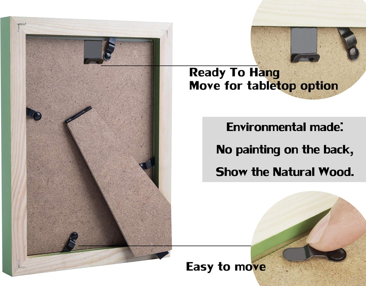 - For Wall and Table: Hang on the wall as vertical or horizontal, or use the included folding stand to place on a table or desk. Hanging hardware included. Comes with easy opening tabs at the back for easy access.