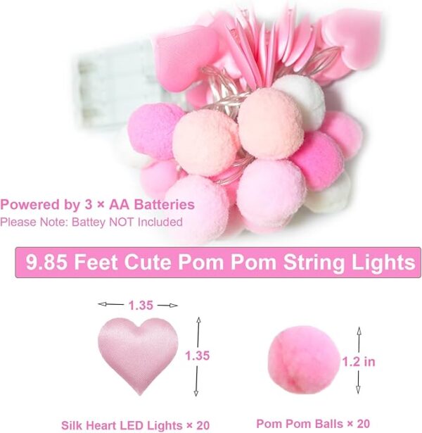 • LIGHTS UP VALENTINE’S DAY with LOVE: This 9.85 feet Valentines Day decorations lights with 20 soft pompoms balls and 20 silk fabric heart pink LEDs lights, create cozy and romantic atmosphere. The combination of lovely heart lights and cute pompom balls, symbolizing happiness, beauty and deep love, create a a warm, inviting, and relaxing Valentine’s Day atmosphere for your room or party, express sincere love