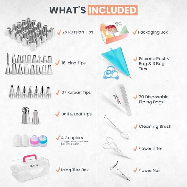 • All-in-1 Premium Cake Decorating Set: RFAQK 90pcs Russian Piping Tips Kit includes all that you need to decorate your cakes, cupcakes, muffins and pastries. 25 Numbered Russian Piping Tips,13 Numbered Icing Tips, 7 Ruffle Tips, 1 Ball Tip, 2 Leaf Tips, 1 Bismarck Tip, 30 Disposable Icing Bags, Reusable Silicone Bag, 2 Icing Coupler, 1 Tri Color Coupler, Single Coupler, 1 Flower Nail, 1 Flower Lifter, 1 Cleaning Brush, 3 Silicone Bag Ties, Pattern Chart Booklet and E-Book in PDF