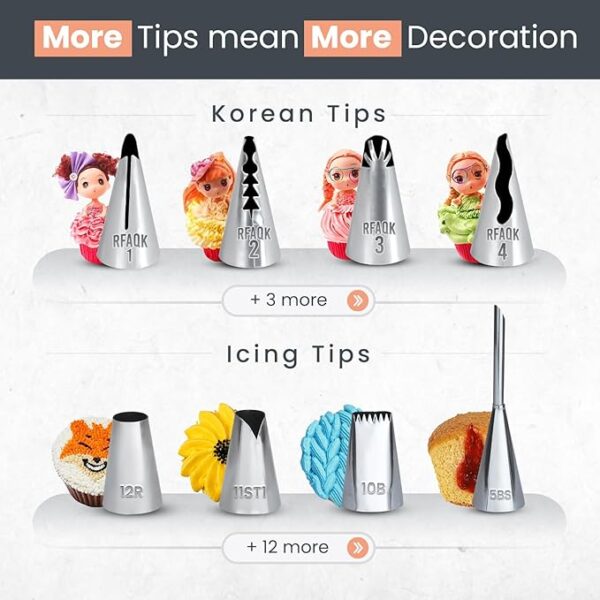 • Only Set Giving 40+ Versatile Numbered Tips (Icing + Russian Piping Tips): No matter even if it’s flower frosting, leaf icing or simple cake decorating this set brings plenty of tips.Easy to use piping tips contains, 25 Russian Piping Tips + 13 Icing Tips + 7 Korean / Ruffle tips + 2 Leaf Tips + 1 Bismark Tip + 1 Ball Tip = 49 Piping Tips