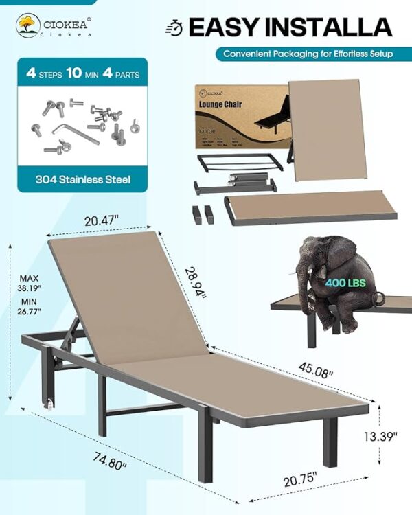 • Convenient Installation: The chaise lounge chair is constructed with a lightweight, aluminum frame, allowing for easy movement. Installation takes only 10 minutes