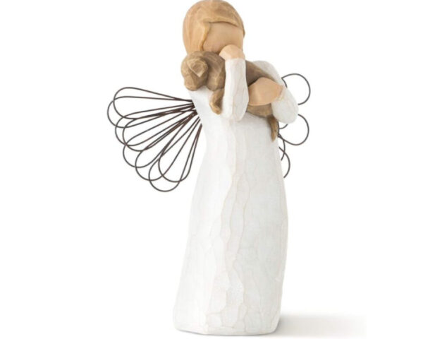 - 5”h hand-painted resin figure of a standing angel in cream dress and wire wings holding brown dog in arms.