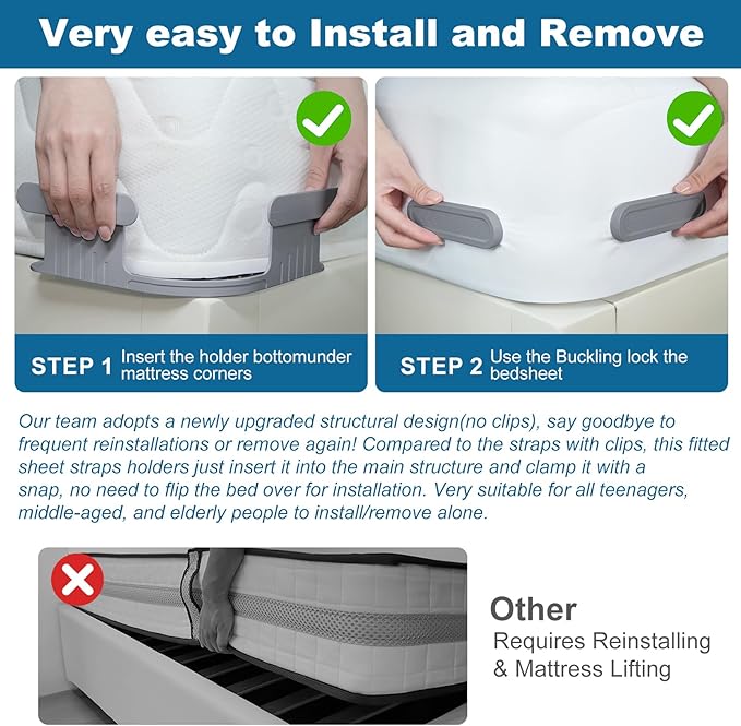 • Very easy to Install and Remove: Our team adopts a newly upgraded structural design(no clips), say goodbye to frequent reinstallations or remove again! Compared to the straps with clips, this fitted sheet straps holders just insert it into the main structure and clamp it with a snap, no need to flip the bed over for installation. Very suitable for all teenagers, middle-aged, and elderly people to install/remove alone.