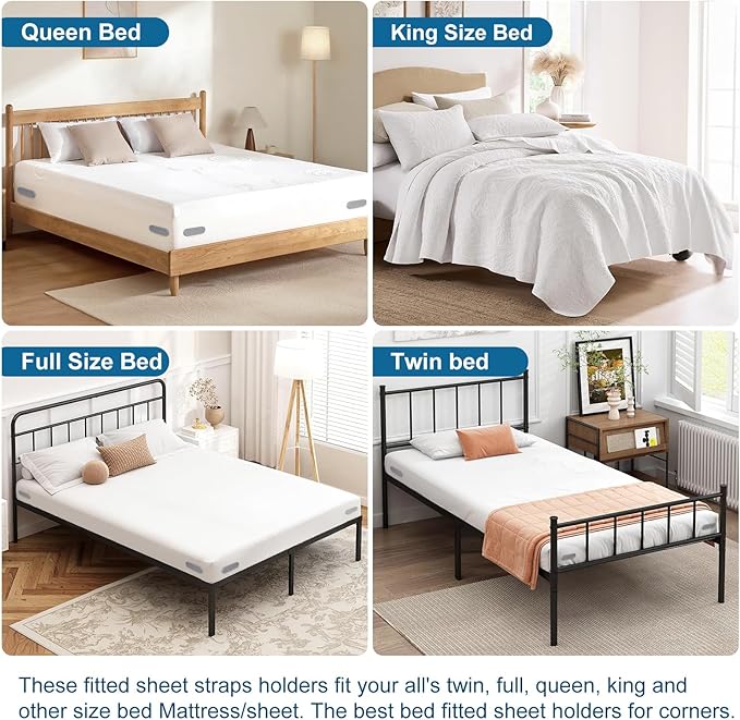 • Fit All Mattress/Sheet Size: These fitted sheet straps holders fit your all’s twin, full, queen, king and other size bed Mattress/sheet. The best bed fitted sheet holders for corners.