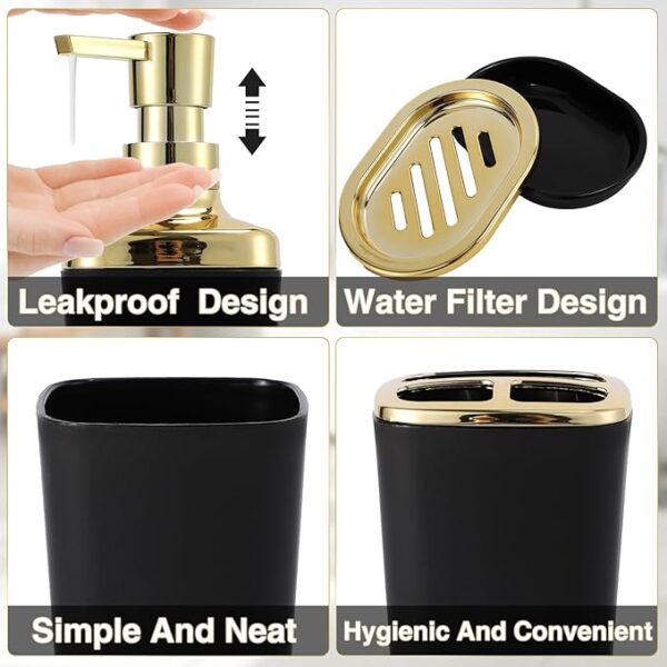 • 1. Luxury Bathroom Upgrades-we have carefully designed this black and gold bathroom set. Our bathroom kit accessories set complete including black and gold trash can with pedal, a Lotion Dispenser,Toothbrush Holder,Toothbrush Cup,toilet brush,Vanity Tray,Soap holder. Bringing the ultimate in quality and convenience to your bathroom.