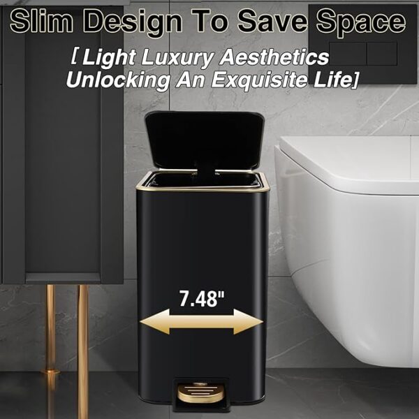 • 5. Create a new bathroom experience-This black and gold bathroom trash can set provides you with an all-around bathroom experience and gives your bathroom a new look. The black and gold bathroom accessories set complete not only a simple trash can, but also a thoughtful assistant for your life, adding more convenience and comfort to your life!
