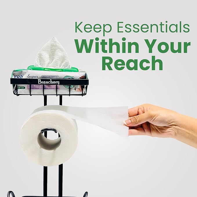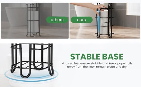 โข ๐๐ญ๐๐๐ฅ๐ & ๐๐๐๐ฎ๐ซ๐ : Our bathroom Black tissue holder has a flat base which ensures the toilet paper holder will not fall over easily. Branchery toilet paper holder stand can load 3 more back-up large extra rolls and will make the holder more stable and balanced. Raised feet make toilet paper shelf stays off floors so the paper keeps always dry and clean