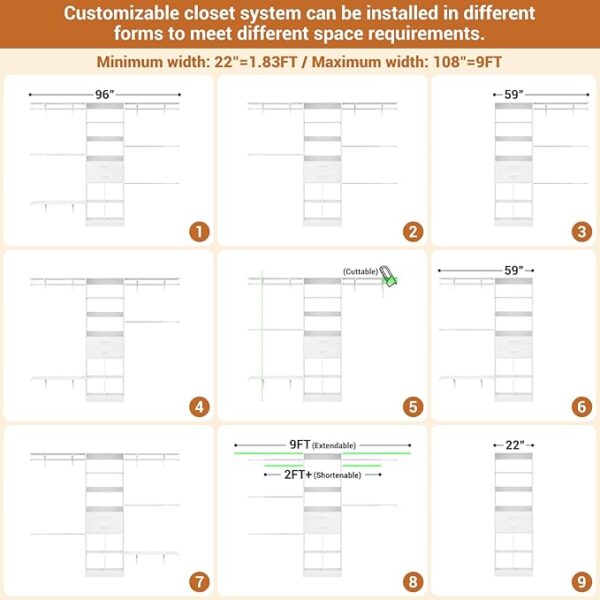 • Customizable Closet System – Besiost closet system with drawers is a valuable addition to your nursery organization and walk-in closets. The small modern closet comes with additional cuttable shelves and adjustable hanging rods, designed to fit well in nurseries of varying sizes. Width: 59″–96″, Height: 80″