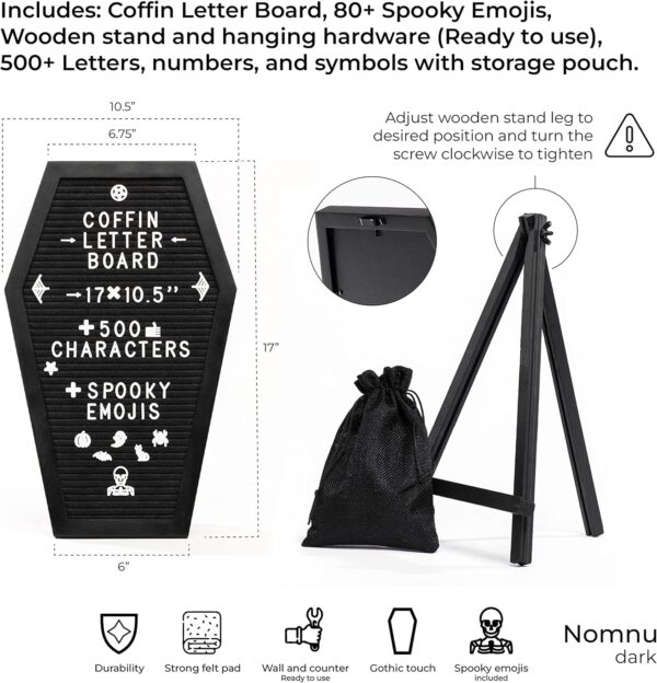 - EERIE EVERYWHERE – Your 17” x 10.5” letterboard features over 500 white characters, +80 spooky emojis, +80 Creepmas and other seasons’ emojis, a wooden stand, and sawtooth hanger for easy display on walls or tabletops. Perfect for gothic stuff enthusiasts and spooky moms, bring a touch of magic wherever you go.