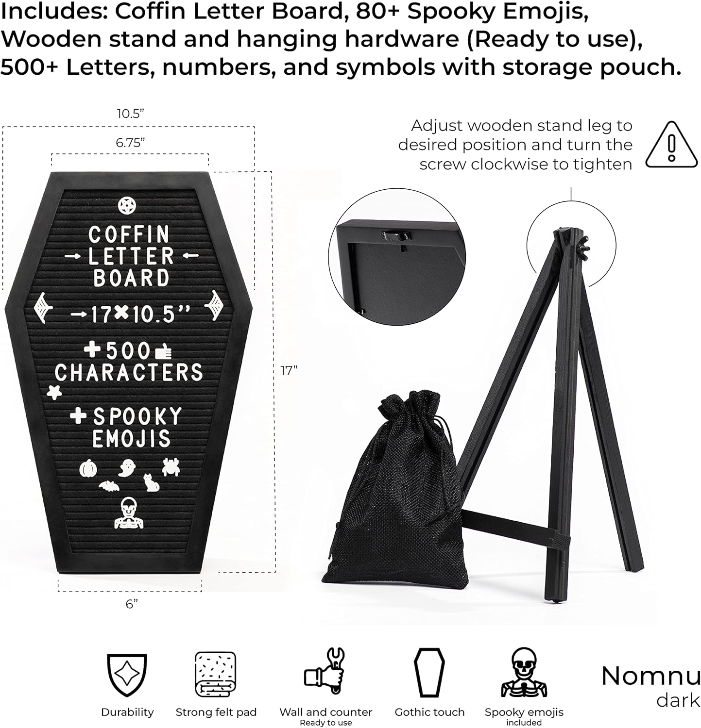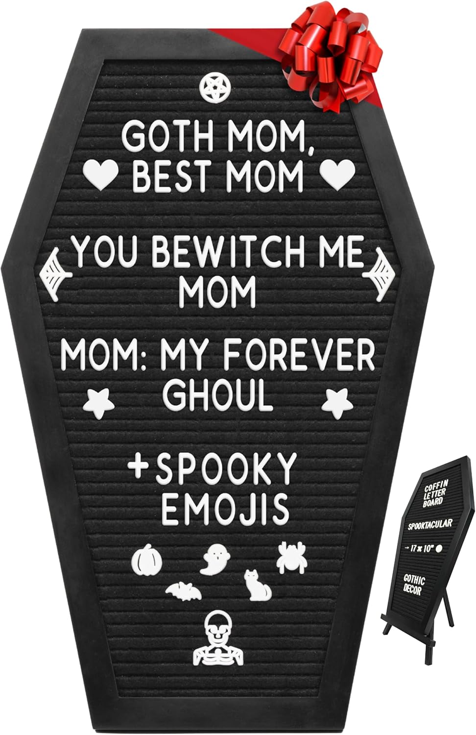 - CALLING ALL YEAR-ROUND SPOOKY LOVERS! Embrace your goth style with our Coffin Black Letter Board adorned with SPOOKY EMOJIS. Ideal for Halloween gifts and gothic room décor, perfect for goth gifts for mom and enthusiasts of macabre aesthetics. Gift wrap and personalized messages available at checkout.
