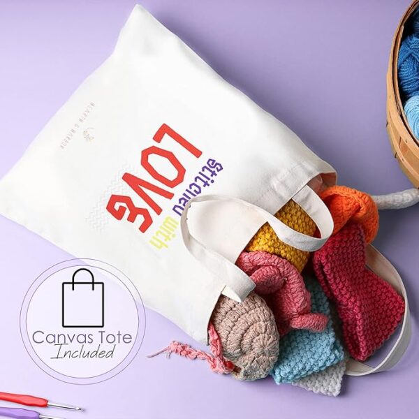 - Crochet Bag Organizer: Keep your crocheting kit for beginners tidy with the crochet storage organizer for crochet accessories and supplies, plus a canvas tote bag that’s perfect for storage and travel.