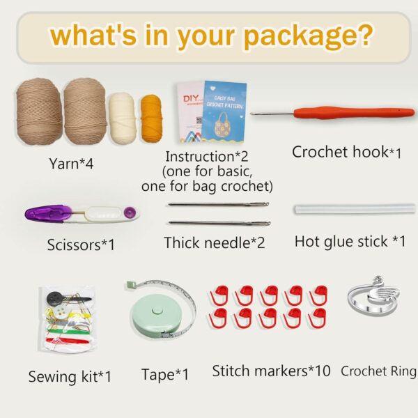 - 👜【 Perfect crochet kit for beginners】: Includes all the essentials: Basic Crochet Manual, Daisy tote bag crochet manual, yarn, needle, safety scissors, stitch markers, tape, sewing kit, and crochet hook. This kit allows you to create two different types of knitted bags, giving you the option to choose between a carrying bag or a shoulder bag based on your preferences – endless fun and creativity.
