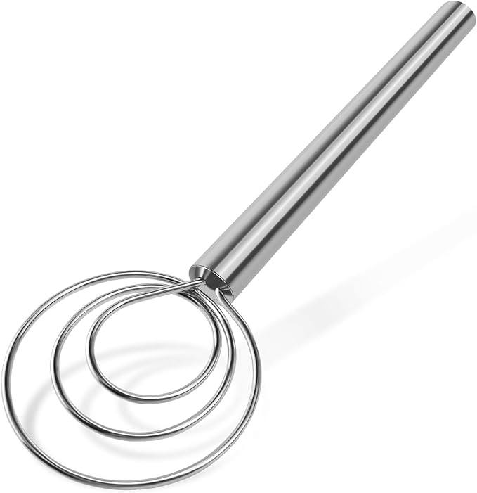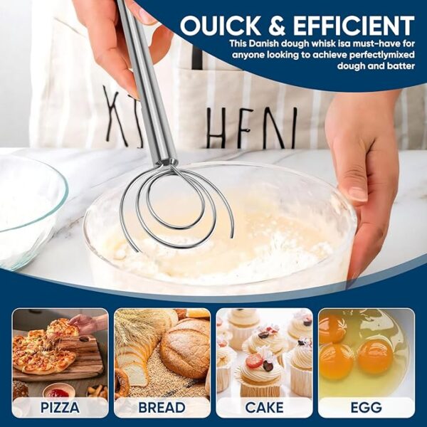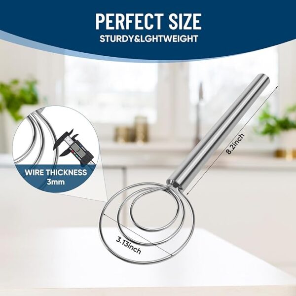 • Easy to Hold: This Danish whisk is made of 304 stainless steel, which has excellent corrosion resistance and rust resistance; its 8.2-inch long ergonomic handle design effectively reduces wrist fatigue during dough mixing and is very comfortable