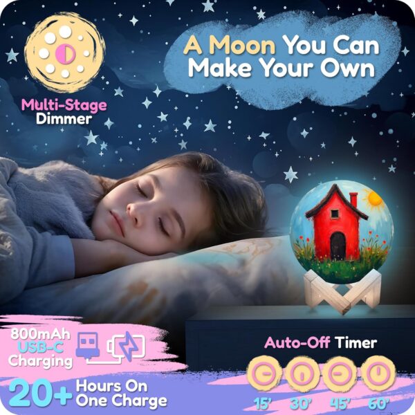 • A Personalized Night Light: Create a truly unique night light that’s as special as your child. With dimmable settings, multi-color features, and 4 lighting modes, the 5-inch moon lamp is both a functional nightlight and a piece of art. Use the remote control to adjust the brightness or set the timer for peaceful sleep.