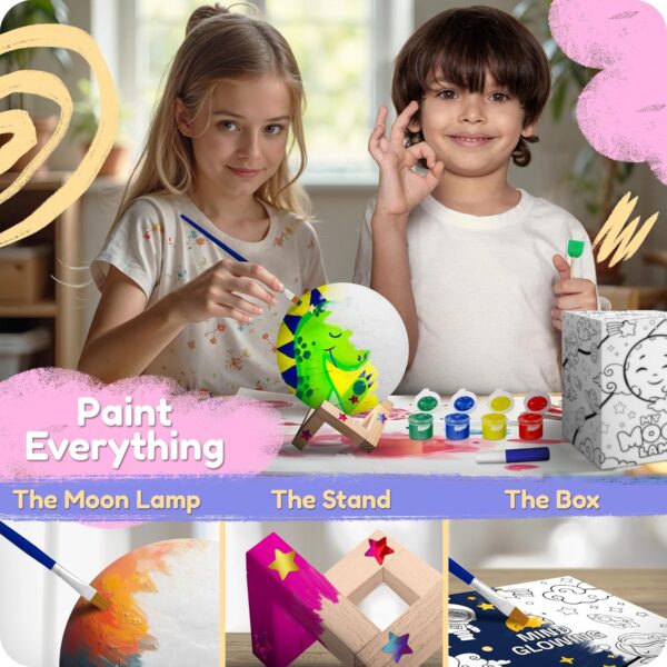 • Unleash Creativity with a Personal Touch: Transform bedtime into a masterpiece with the Paint Your Own Moon Lamp kit! Kids can paint the moon, customize the wooden stand with glow-in-the-dark markers, and even bring the box to life with their favorite colors. It’s more than a lamp—it’s a creative adventure!