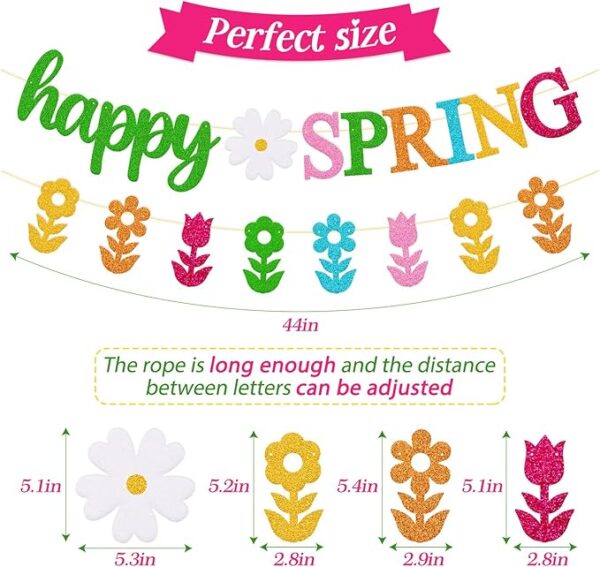 • Have Been Prefabricated and Banner Size:Don’t need any time to assemble.The happy spring banner set comes pre-strung , no assembly required for buyer!the banner is easy to hang and remove,the distance between letters is adjustable, fit for many ways using. The happy spring banner is approx 44” inches in length,the different colorful bouquet of flowers patterns banner is approx 44” inches in length.