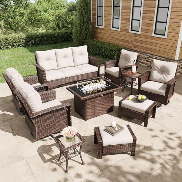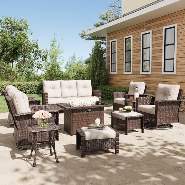 LayinSun 10-Piece Wicker Patio Set with Fire Pit & Swivel Chairs