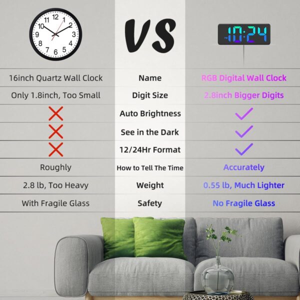 - SMALL DIGITAL WALL CLOCK WITH LARGE DIGITS — This LED Wall Clock is boasting 2.8-inch big digits, which is much bigger than 16-inch Traditional Wall Clock, whose digit size is only 1.8-inch.