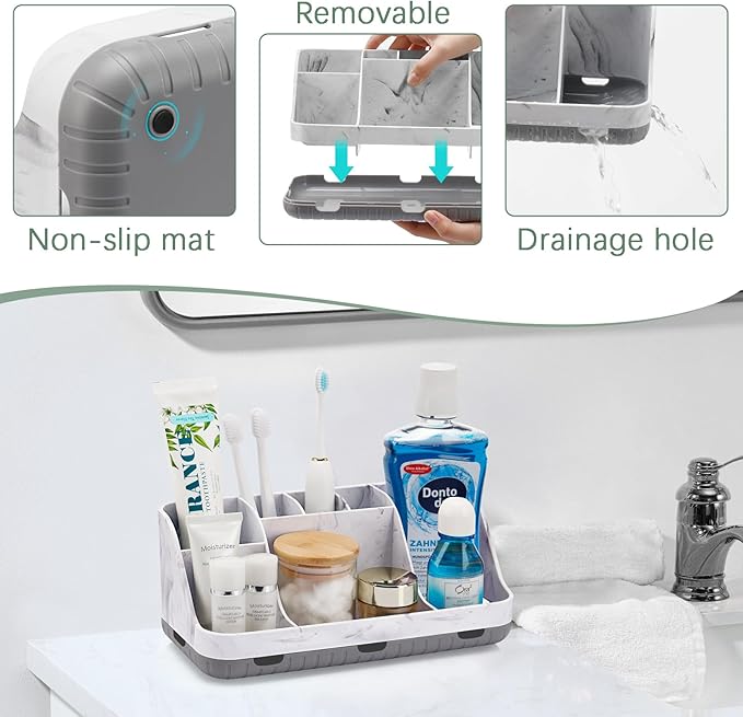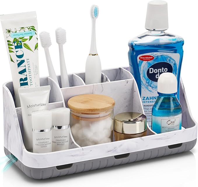 • SUPERIOR ORGANIZATION: The marble bathroom countertop organizer is designed with 2 tiers and 7 slots for large space. The layered divider design can separately organize bathroom accessories such as electric toothbrush, toothpaste, cosmetics, mouthwash, razor and dental floss