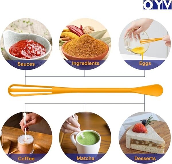 • Multi-Function: OYV’s mini whisk features a whisk on one end and a mini spoon on the other, providing versatility for blending, mixing, and stirring. Perfect for dry ingredients, sauces, hot chocolate, eggs, coffee, and more