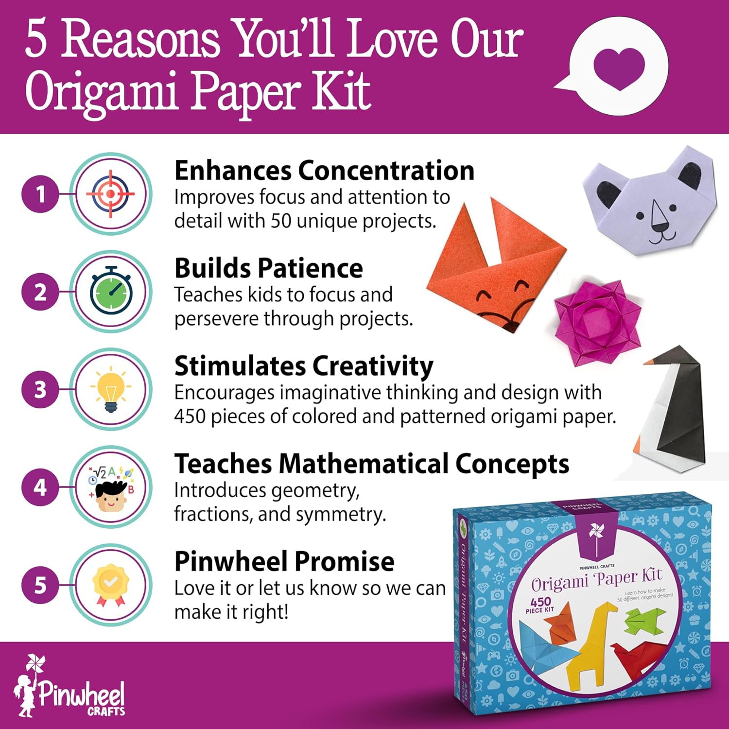 • 50 UNIQUE ORIGAMI PROJECTS – with a whopping 50 different origami projects, you’ll never run out of exciting creations to fold. From intricate animals like birds and foxes to elegant origami hearts, our origami kit provides endless artistic possibilities for all abilities