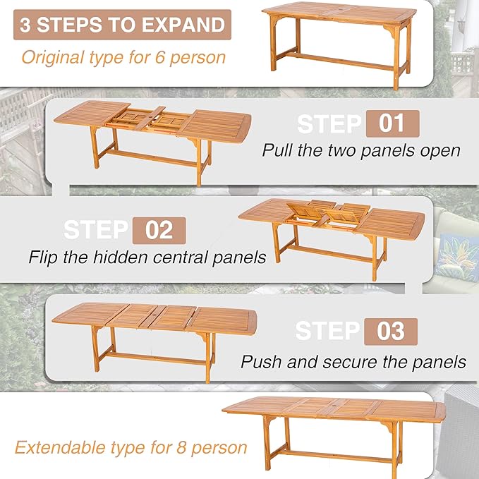 • Robust Durability:The entire surface of this patio table has undergone a meticulous oil finish treatment. This special processing endows the table with remarkable durability, enabling it to endure the harsh elements of snow, rain, wind, and high temperatures over an extended period.