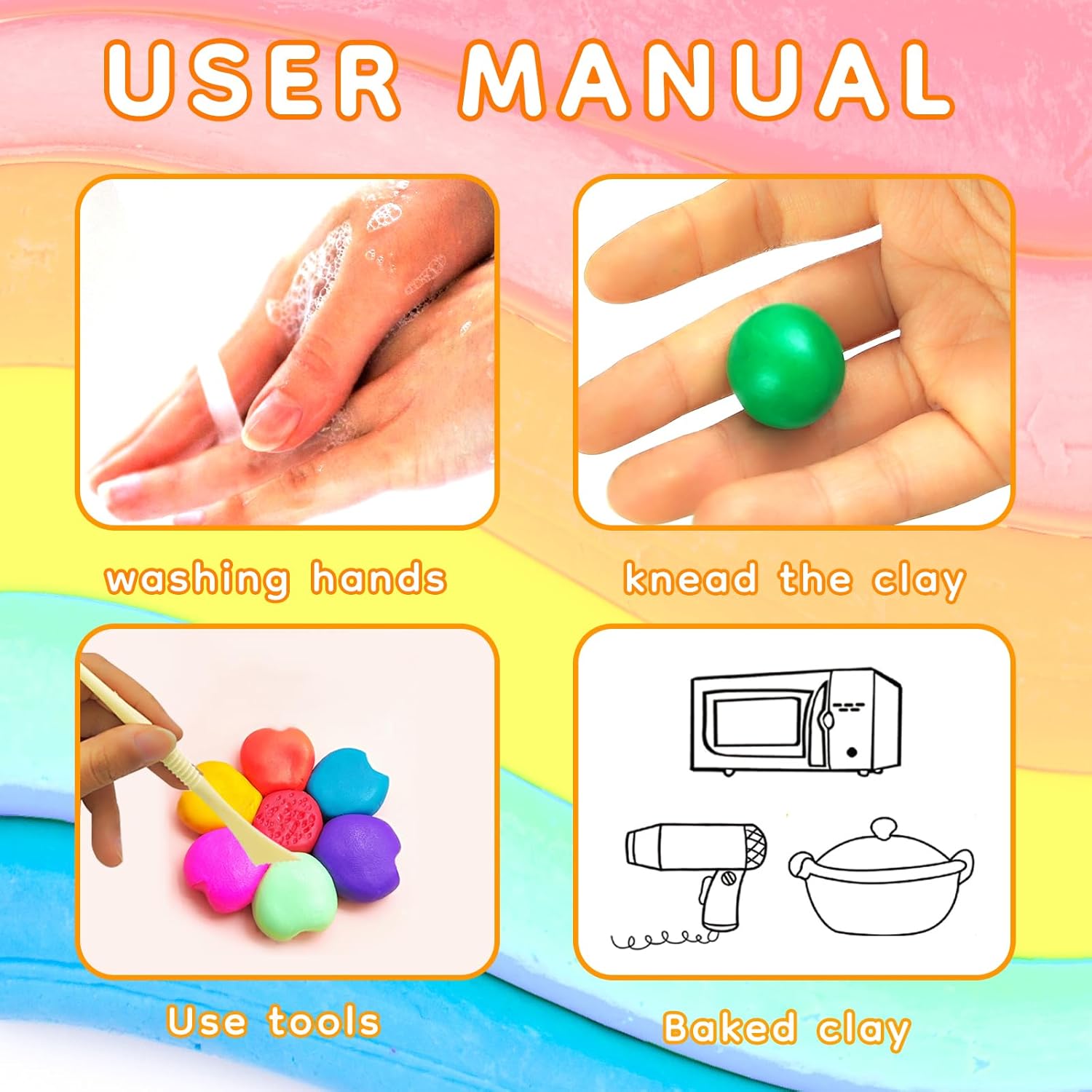 • Stereotypes Method: 1.Oven Bake (Recommend, oven set temperature of 120-130℃ and bake 15-30 minutes) (Please refer to the user manual for details). 2.Hair Blower Heating (Suitable small works size in 1-2 inch). 3.Boil method (suitable small works size in 1/3 inch)